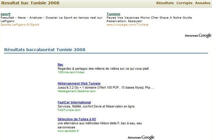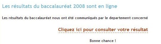 Un exemple bien récent pourrait bien illustrer la situation : La Tunisie a vécu ces derniers jours l’évènement de la proclamation des résultats du baccalauréat 2008. Le 20 Juin 2008, le soir, et en attendant que le service des SMS ne soit activé, des candidats recourent à l’Internet pour voir si les résultats sont proclamés sur un des sites web. Et puisque les sites « officiels » ne présentaient pas les résultats ce soir là, le recours aux moteurs de recherche était une alternative pour la découverte des autres sites susceptibles de mettre en ligne les résultats. C’est ainsi qu’on retrouve un bon nombre de sites web tunisiens qui prétendent proclamer les résultats… Parmi eux, un m’a particulièrement attiré l’attention ! Un très bon référencement sur les moteurs de recherche puisque l’expression « proclamation des résultats bac 2008 » était « parachutée » partout ! A droite, à gauche, et des fois loin même du texte ! Ensuite, et bien qu’ils n’aient guère le droit de mettre en ligne les résultats avant le 8 Juillet 2008, on retrouve quand même en bas un lien « consulter votre résultat » :
